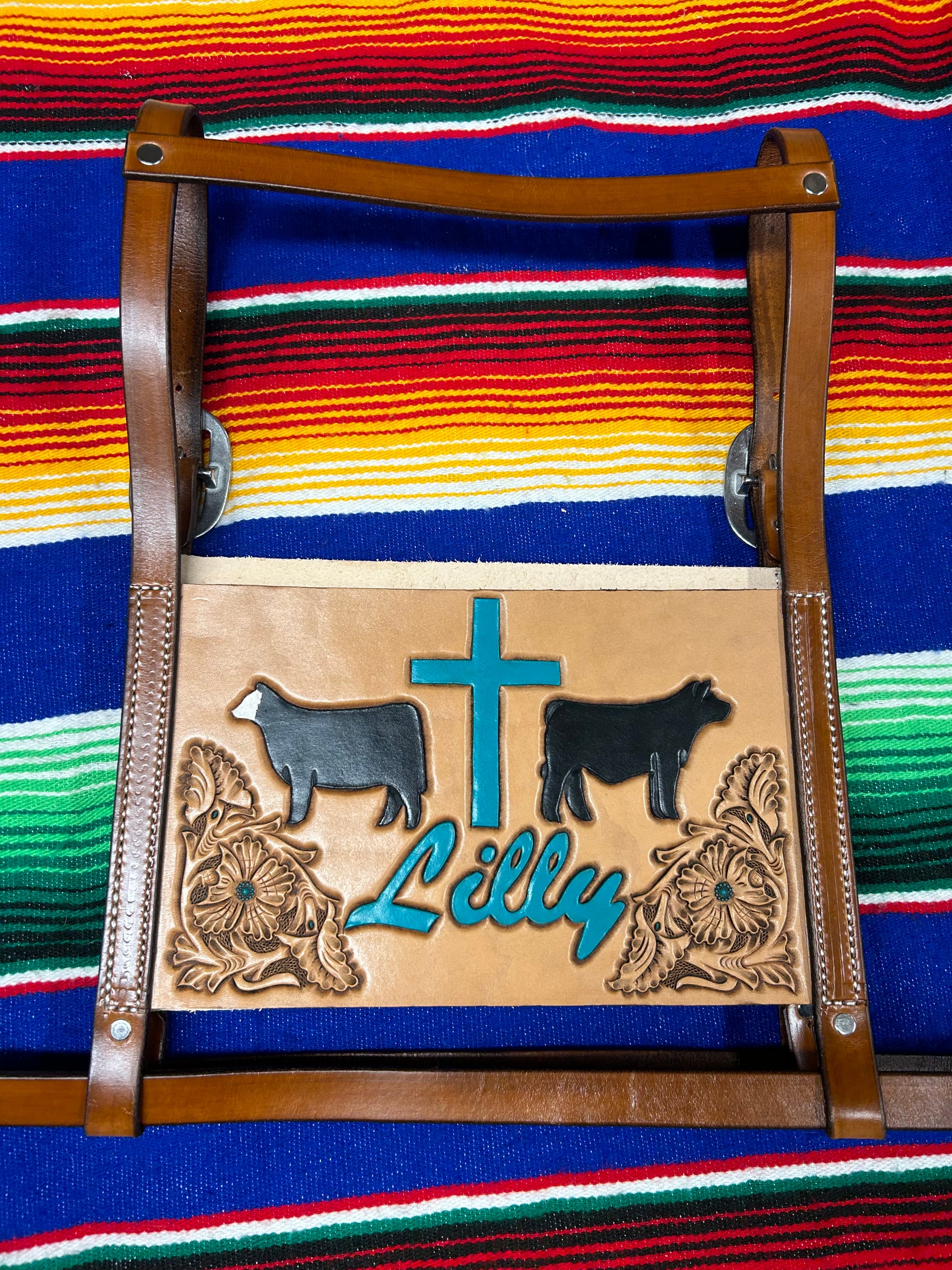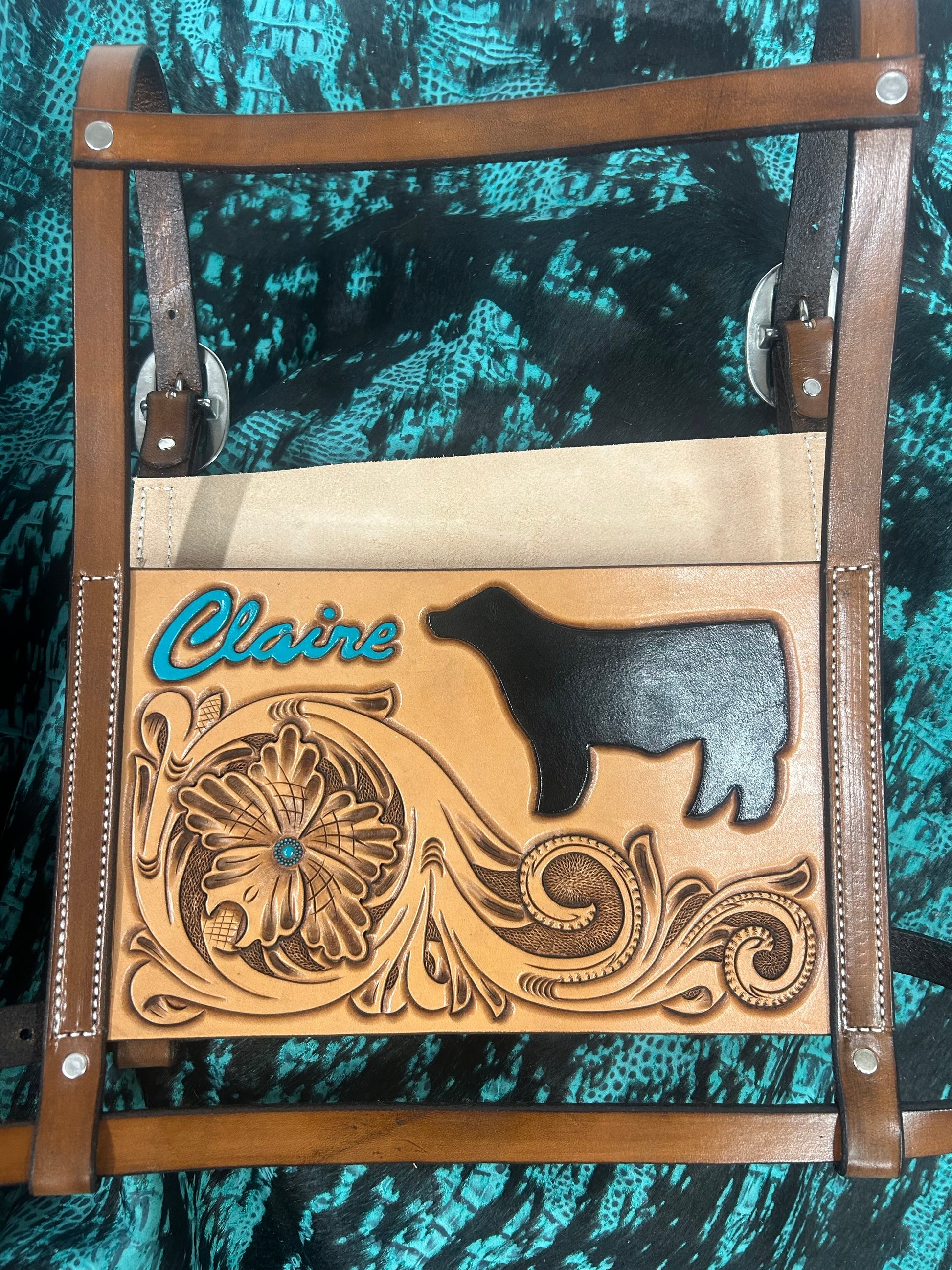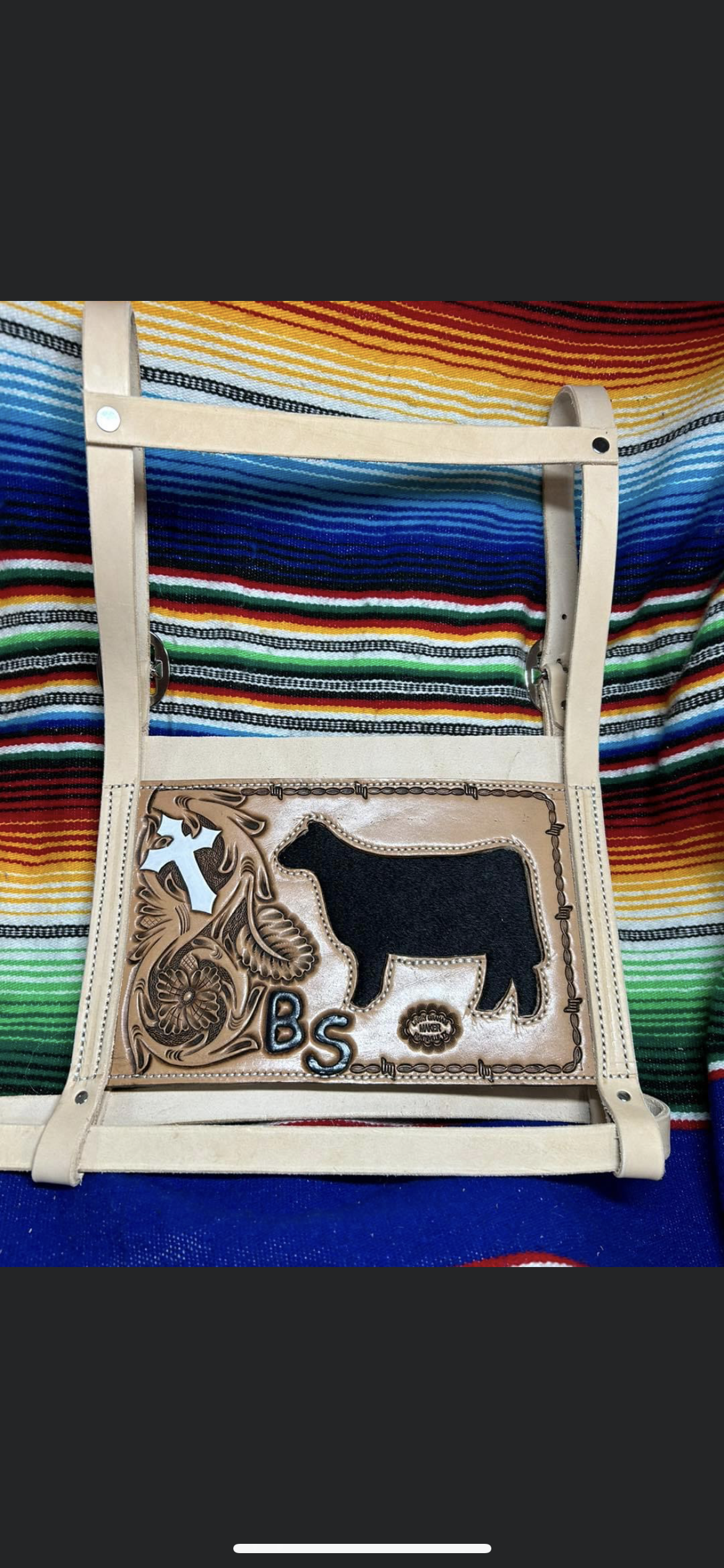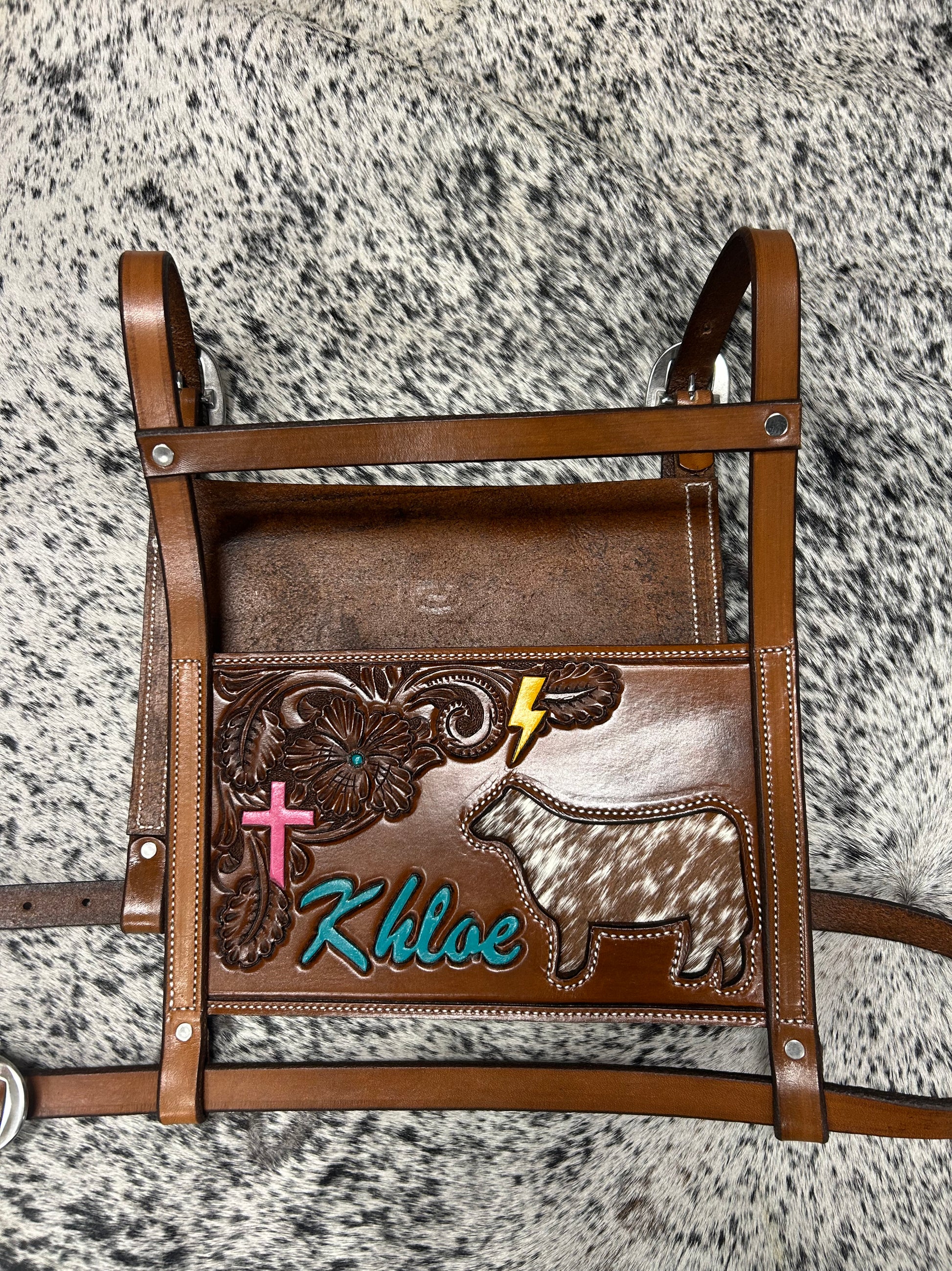 This is a custom handmade leather show harness for livestock show exhibitors. These are the more detailed in design and art work. These harnesses are the most popular. The buyer can choose the design, coloring, and tooling that they would like. The maker can accommodate different sizes of exhibitors from small children to adults. The harness will be adjustable, so it can grow with the wearer.