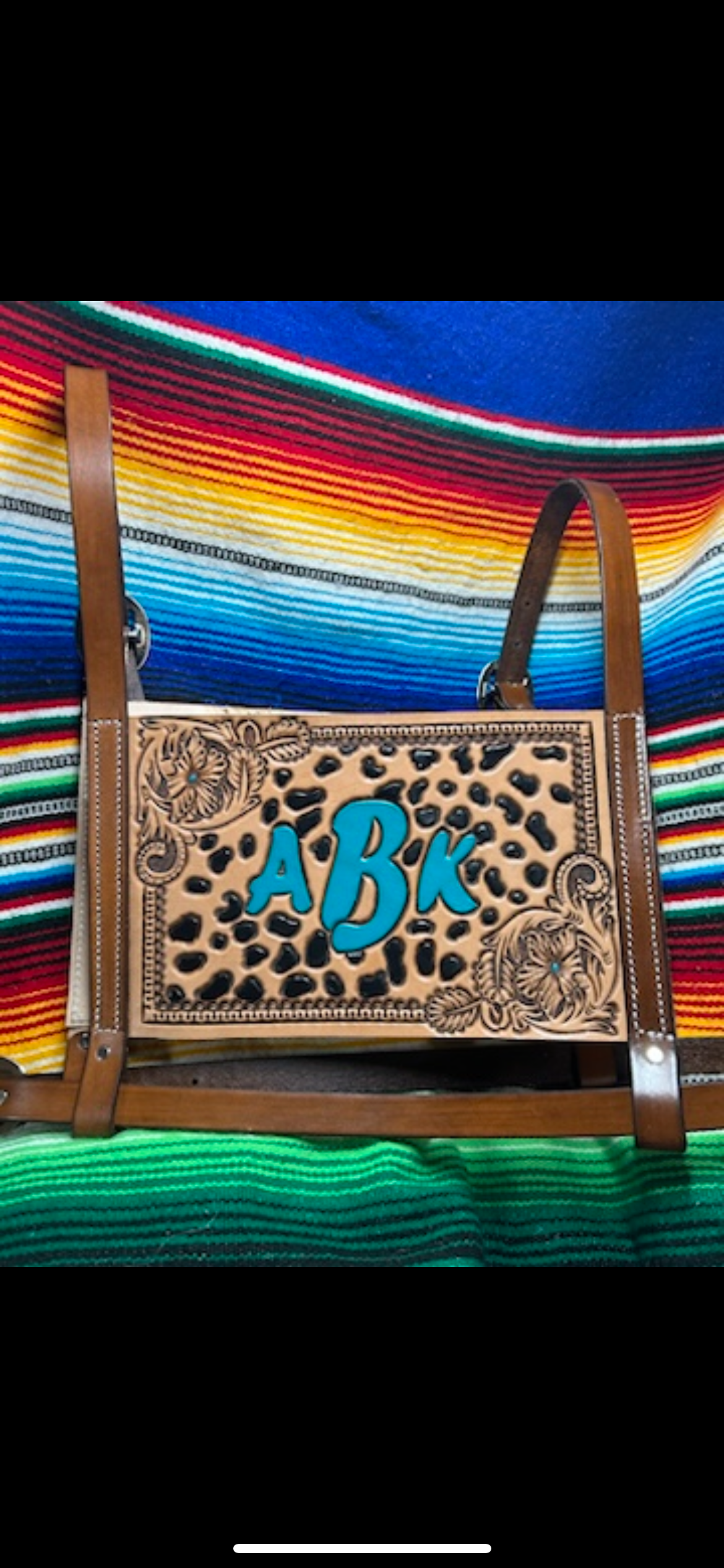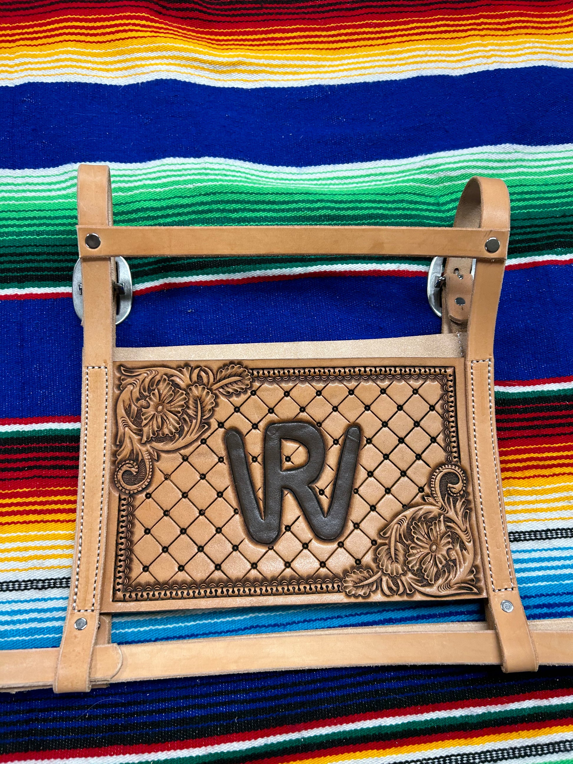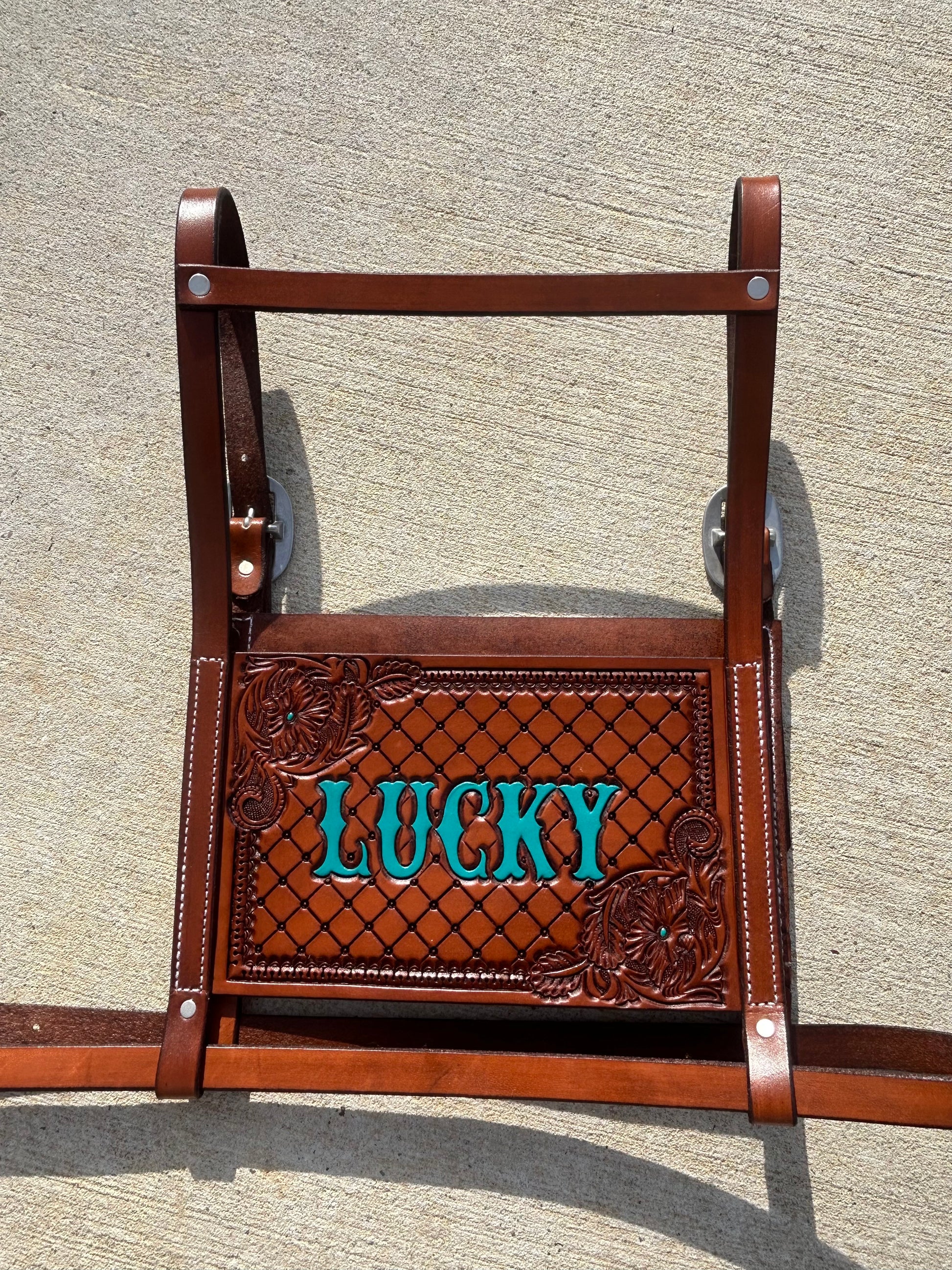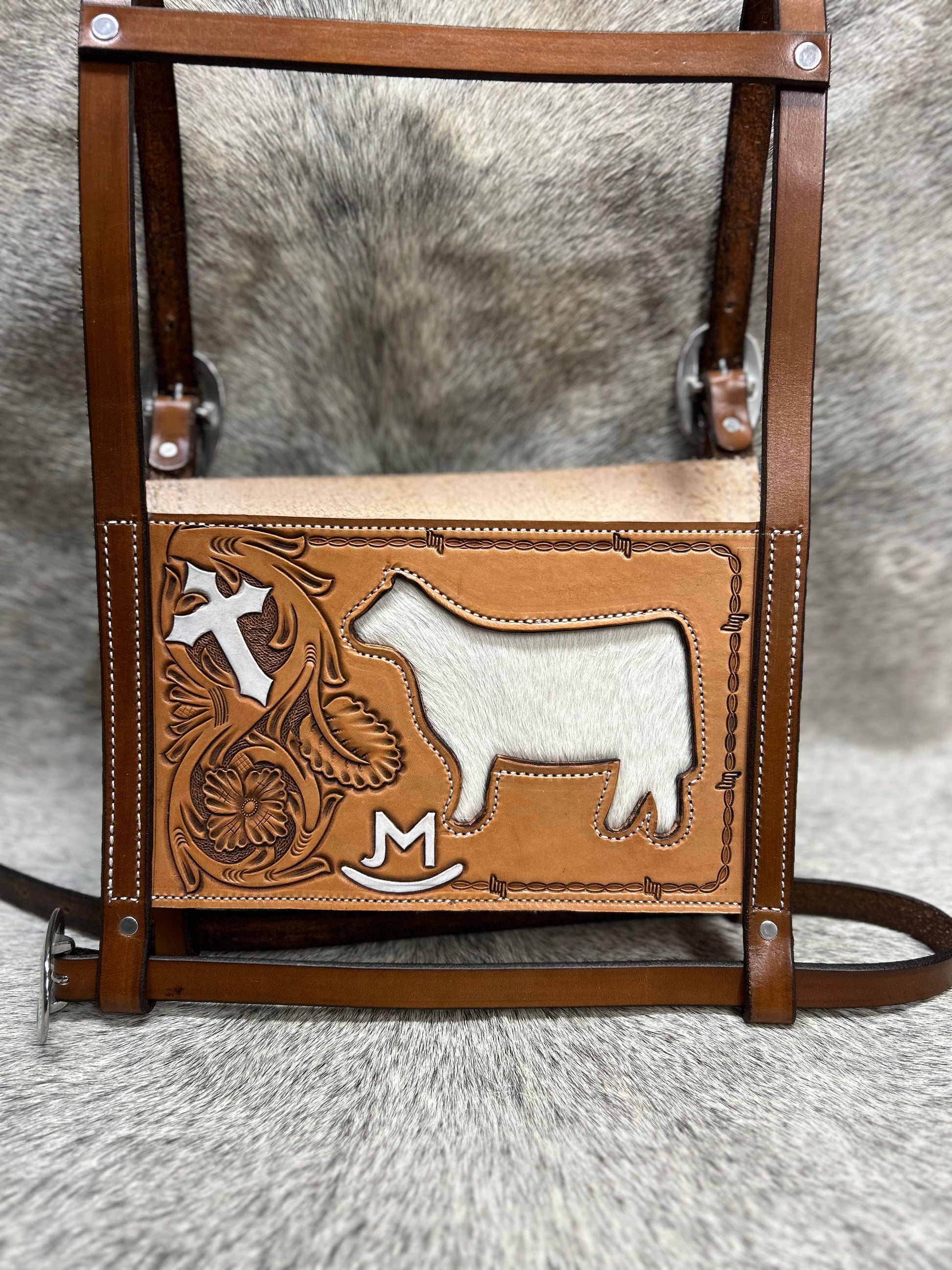 This is a custom handmade leather show harness for livestock show exhibitors. These are the more detailed in design and art work. These harnesses are the most popular. The buyer can choose the design, coloring, and tooling that they would like. The maker can accommodate different sizes of exhibitors from small children to adults. The harness will be adjustable, so it can grow with the wearer.