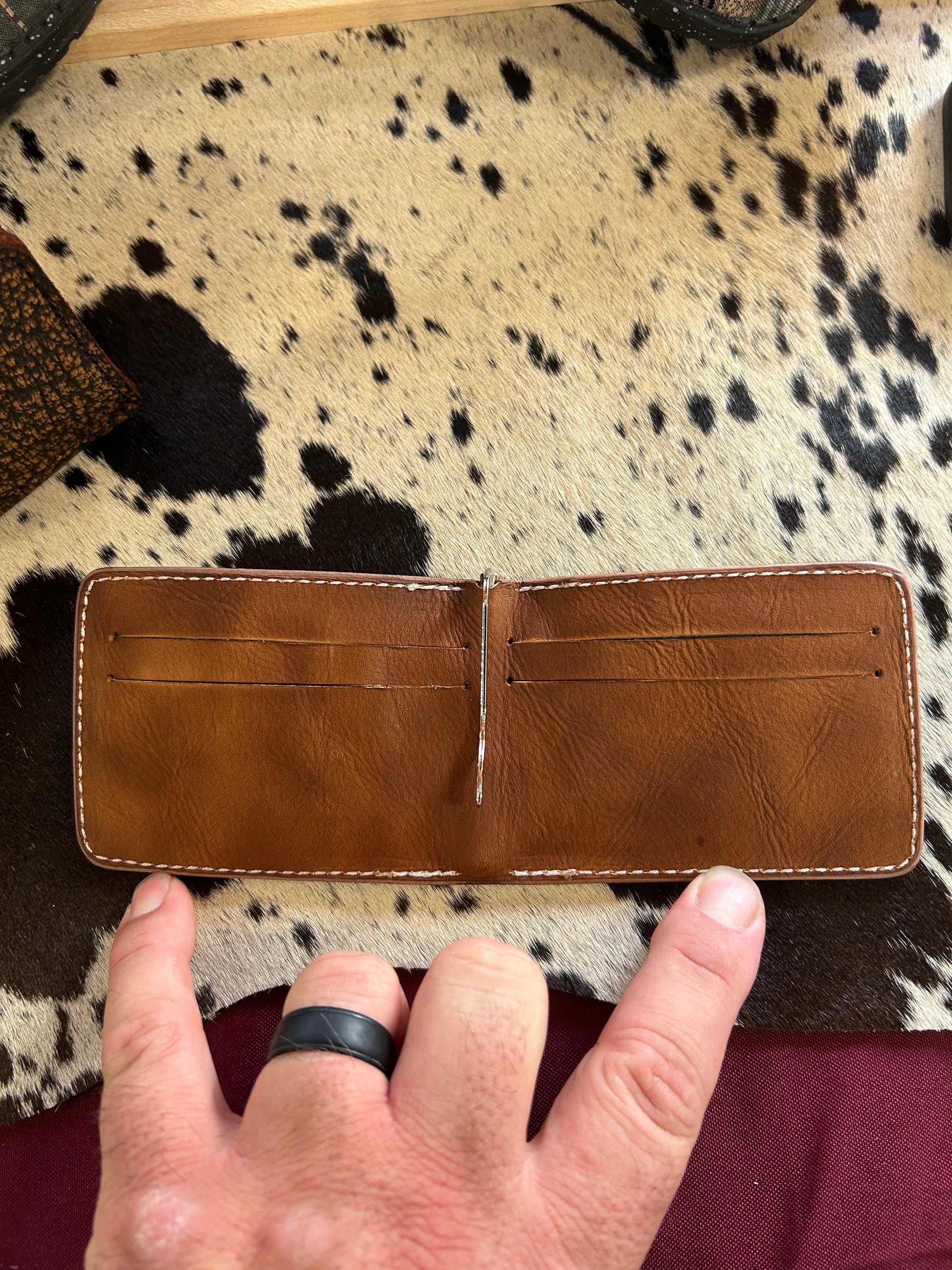 This front pocket wallet is a floral design on one side followed with tooled basket weave through out. This wallet has 4 card slots and a money clip on it! This wallet is ready to ship but if you would like a wallet like this or a different wallet you can always email us to get one customized to you!