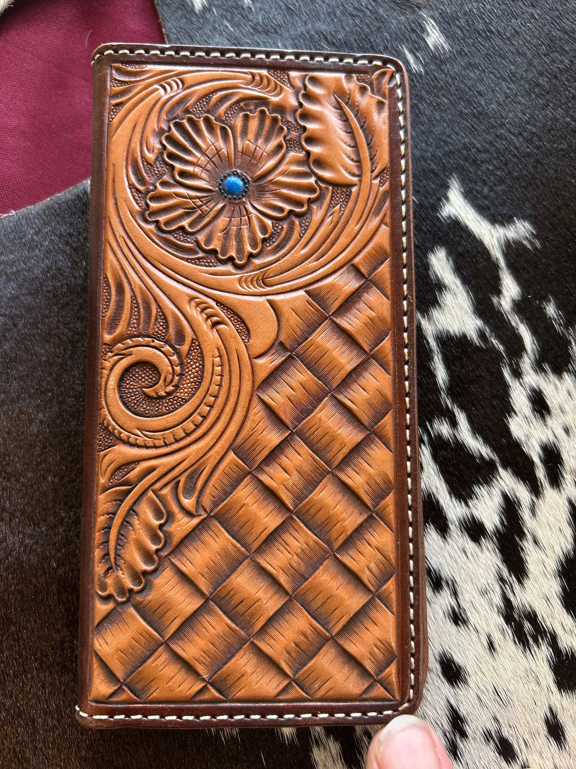 This Roper wallet has a floral design mixed with tooled basket weave for the perfect look. This wallet has 6 card slots with a bill holder and 2 hidden pockets! This wallet is ready to ship but if you would like a wallet like this or a different wallet you can always email us to get one customized to you!