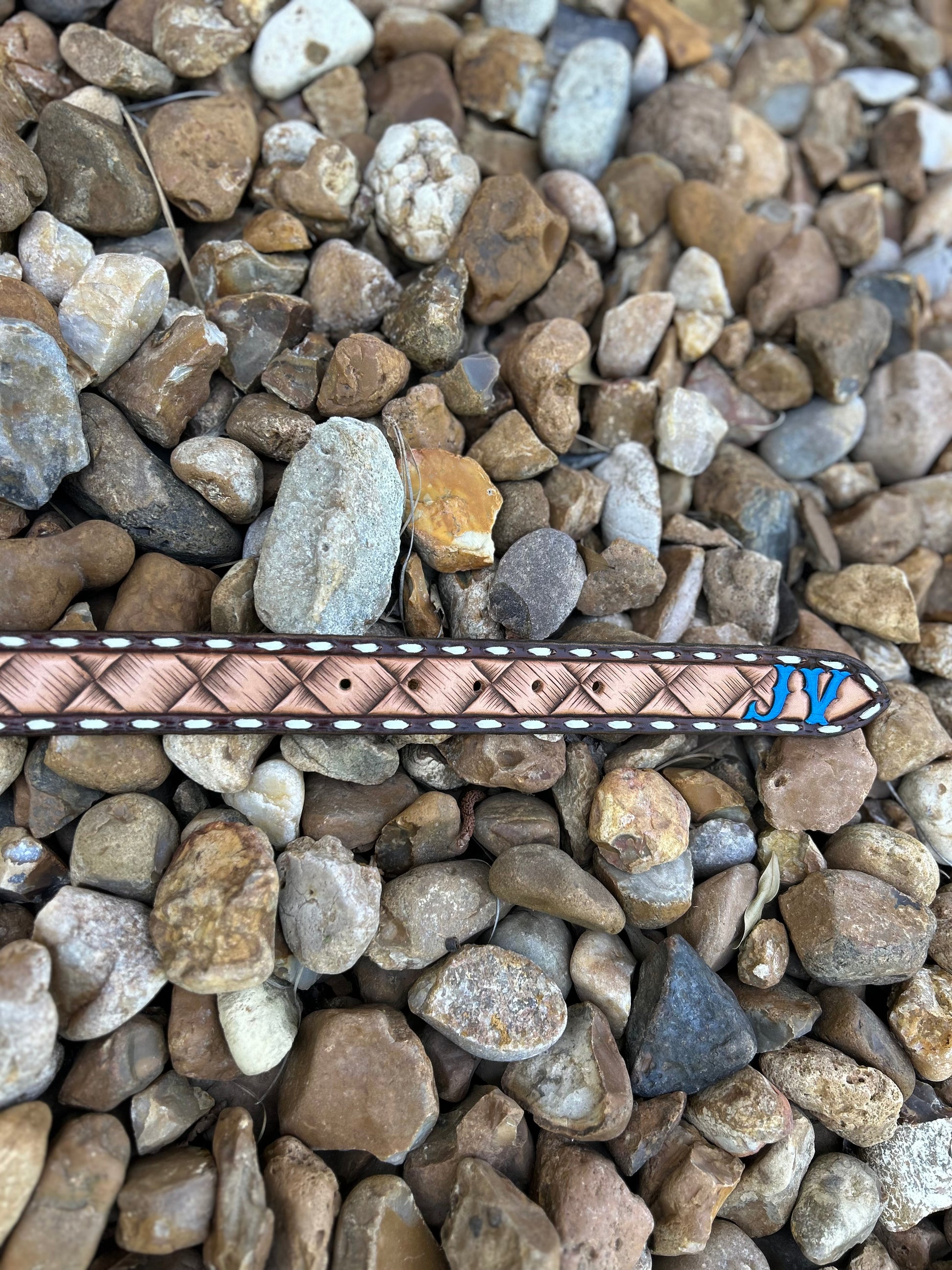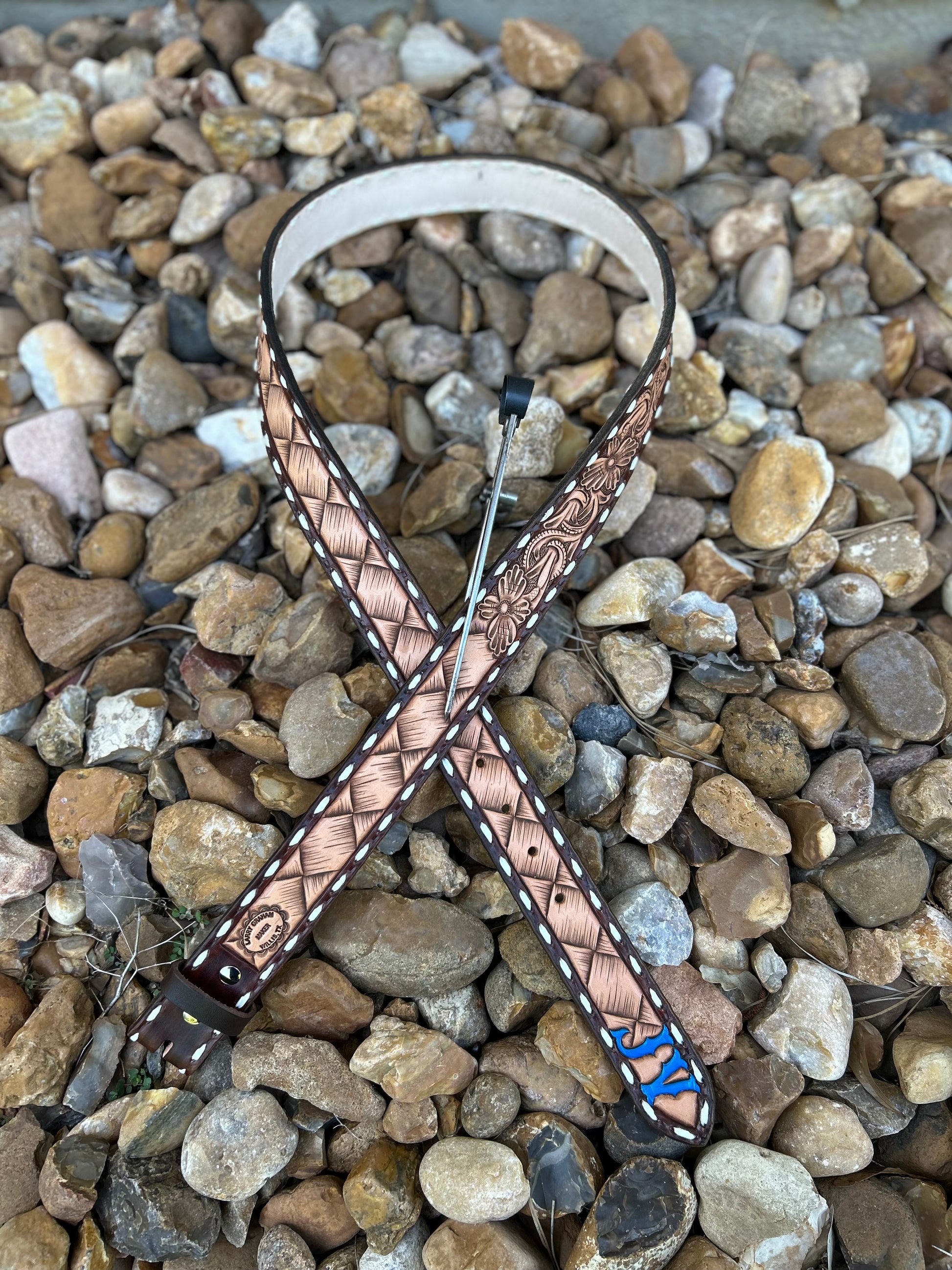These tooled belts are with buckstiching. Buckstiching is an old look that's starting to make a comeback. Buckstiching is a great way to add a great look to a belt. You have any color buckstitch you would like.